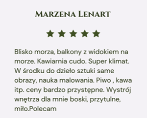 Tych i wielu innych smaków skosztujecie we wspaniałych wnętrzach położonego bezpośrednio przy linii brzegowej pensjonatu – pełnych koronki, przepięknych obrazów i porcelanowych bibelotów. Kawy i herbaty podajemy w wyszukanych filiżankach, przywożonych z całego świata. Serdecznie zapraszamy do naszej kawiarni, gdzie przy dobrej muzyce, a zimą również przy kominku mogą się Państwo zrelaksować i spędzić niezapomniane chwile.